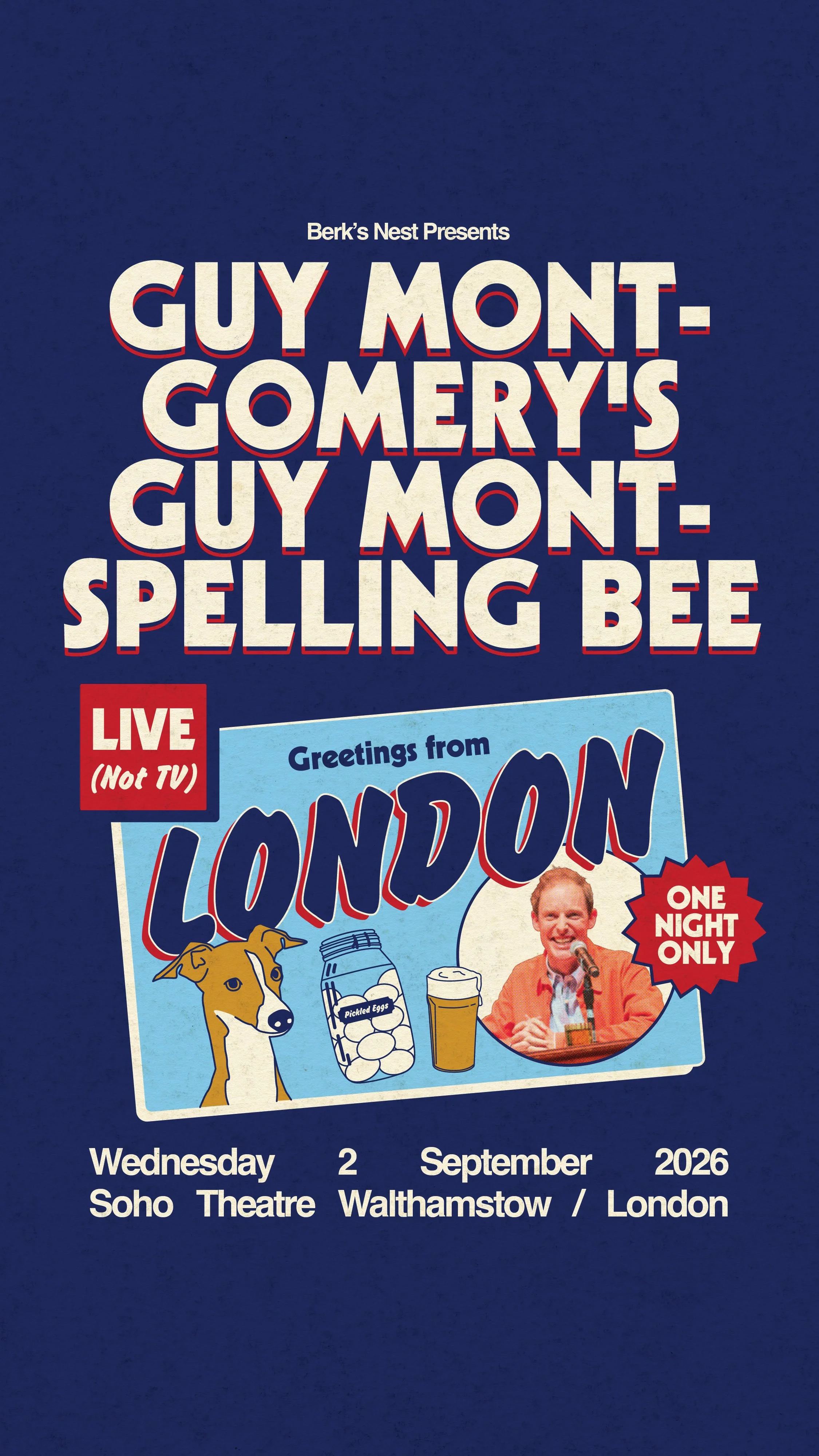 For the first time in its history and for ONE NIGHT ONLY the Guy Mont-Spelling Bee will come to life in London on Wednesday 2 September. Previously only seen on BBC iPlayer and at the Edinburgh Fringe in the UK, this is a rare chance for fans in England to see the comedy phenomenon live.