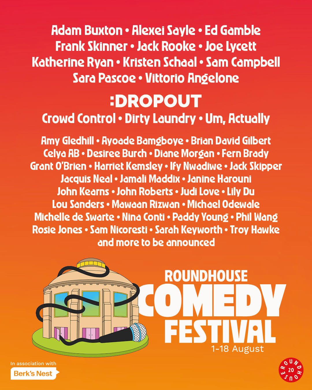 The 2026 festival features comedy megastars like Frank Skinner, Ed Gamble, Katherine Ryan, Joe Lycett, Sam Campbell, Sara Pascoe and Vittorio Angelone. You can also catch live recordings of Adam Buxton and Alexei Sayle’s respective podcasts, plus US comedy streamer Dropout’s Crowd Control, Um, Actually and Dirty Laundry*. Jack Rooke brings the revival of his breakout show Good Grief to the festival as part of his highly-anticipated UK tour, while Flight of the Conchords and Bob’s Burgers star Kristen Schaal’s new comedy play The Legend of Crystal Shell comes to the Roundhouse. Taskmaster contestants past and present also feature on the line-up (including Amy Gledhill, Phil Wang and Rosie Jones, to name a few), as well as SNL UK stars Paddy Young and Ayoade Bamgboye.